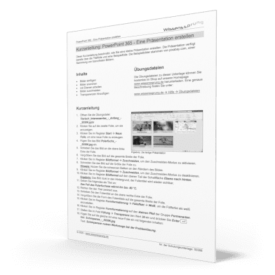 Diese Kurzanleitung beschreibt, wie Sie eine kleine Präsentation erstellen. Die Präsentation verfügt bereits über die Titelfolie und eine Beispielfolie. Die Beispielbilder stammen von pixabay.com, einer Sammlung von lizenzfreien Bildern.